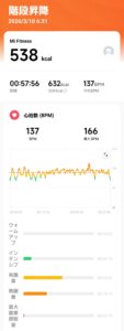 今回は中2日で階段の登り降り朝活でした。運動時間は58分、総消費カロリー606 kcal程度、有酸素運動領域の時間43分弱程度でした。あまり無酸素運動領域へ入り過ぎず、効率よく気分の良い運動ができました。